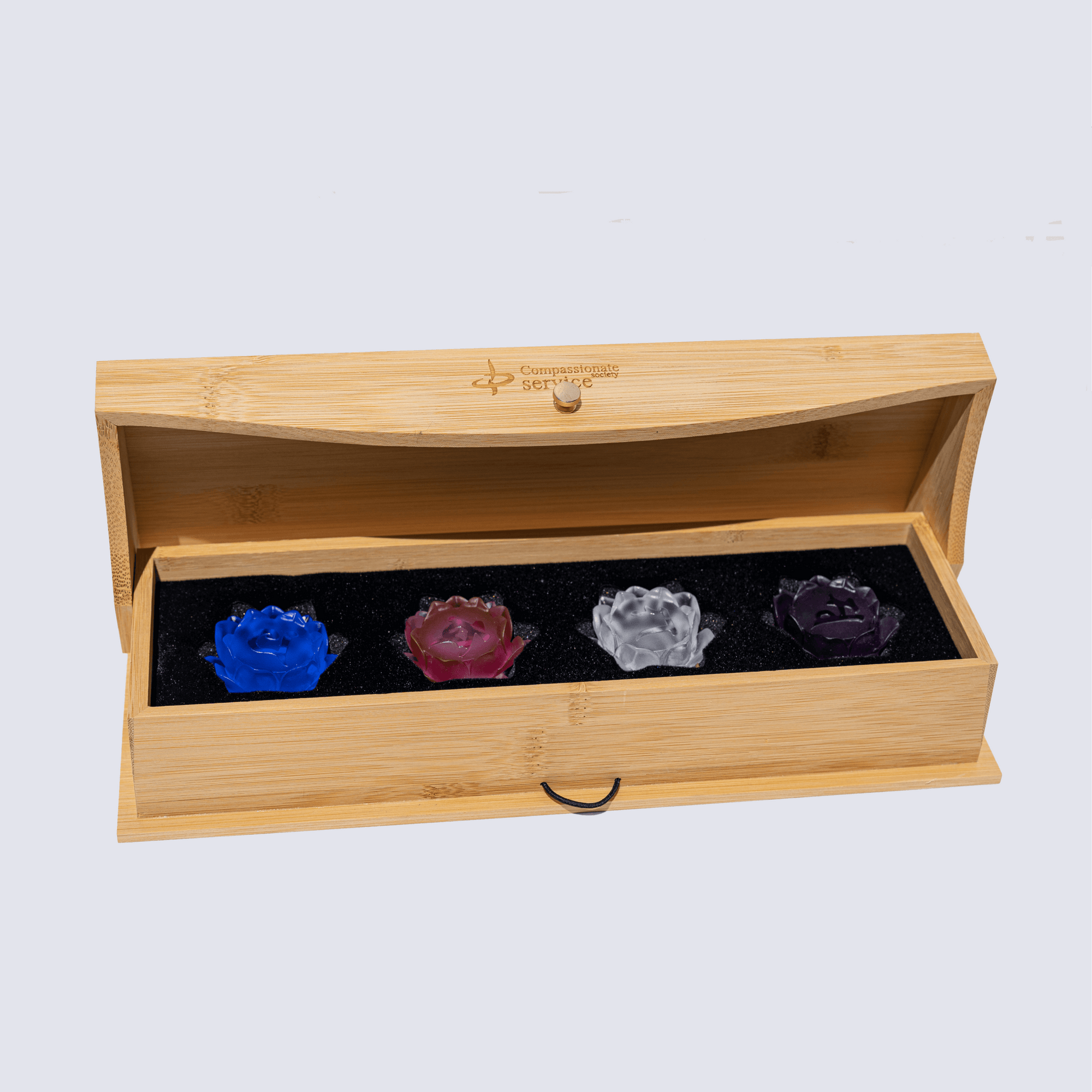 Chiếc hộp gỗ này đi kèm với 4 hoa sen bằng pha lê gồm các màu Xanh, Đỏ, Tím và Trắng. Mỗi màu đều có đặc tính riêng.